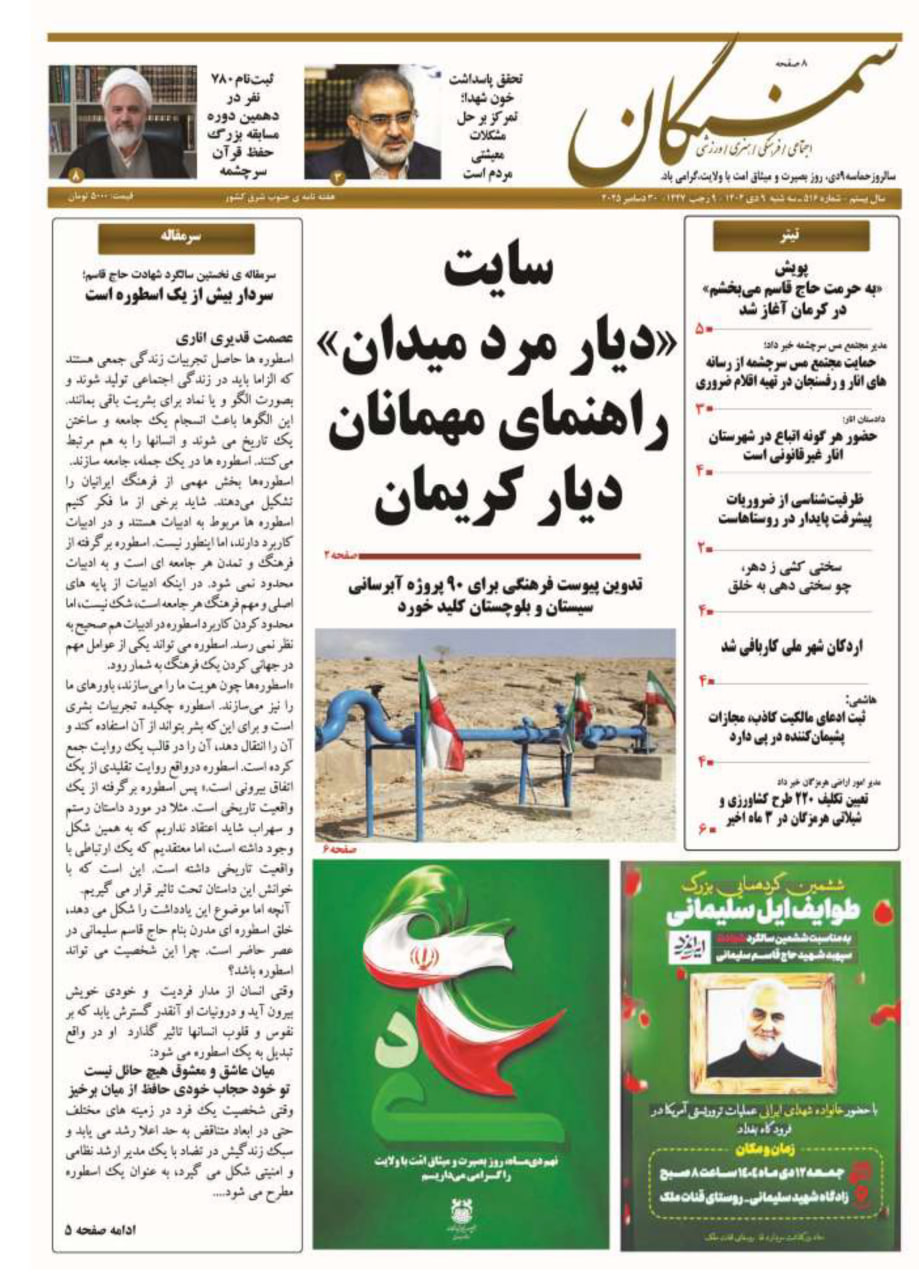 تیترهای خبری مطالب ویژه هفته نامه سمنگان (شماره ۵۱۶) بر اساس بررسی محتوای هفته نامه، مطالب ویژه عمدتاً شامل گزارشهای فرهنگی، یادداشتهای مرتبط با شهید سلیمانی، اخبار محلی کرمان و انار، حوادث و مسائل حقوقی است. تیترهای اصلی به صورت فهرستشده استخراج شدهاند: سایت «دیار مرد میدان» راهنمای مهمان